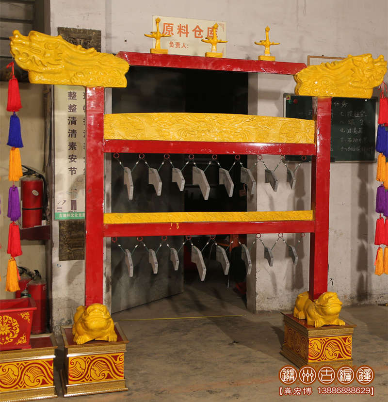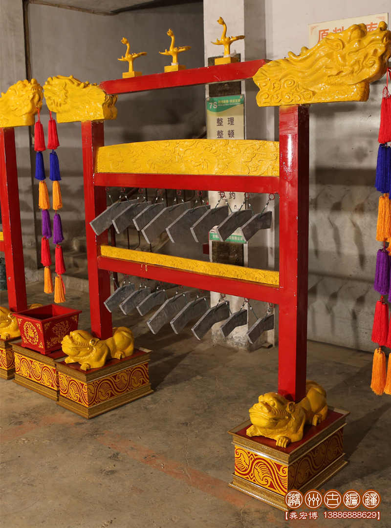 簡介:磬質靈璧響石,磬面飾描金龍紋。編磬為古代樂器一種,用石或玉制作,十六面一組。它的音色,除黃鐘、大呂、太簇、夾鐘、姑洗、仲呂、蕤賓、林鐘、夷則、南呂、無射、應鐘等十二正律外,又加四個半音,演奏打擊時,發(fā)出不同音響,在重大典禮演奏中和韶樂時使用。