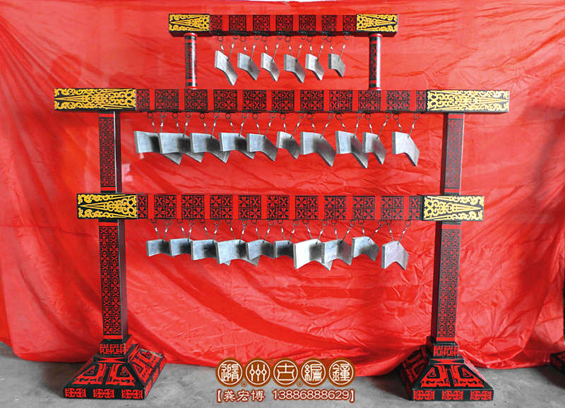 16件套系編磬規(guī)格:長2米×寬0.4米×高1.8米,懸掛22塊磬片,共三層,上空,中11塊,下11塊,編鐘編磬的大梁和底桌采用優(yōu)質(zhì)杉木加工制作,表面彩繪仿古花紋。