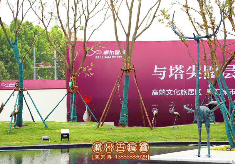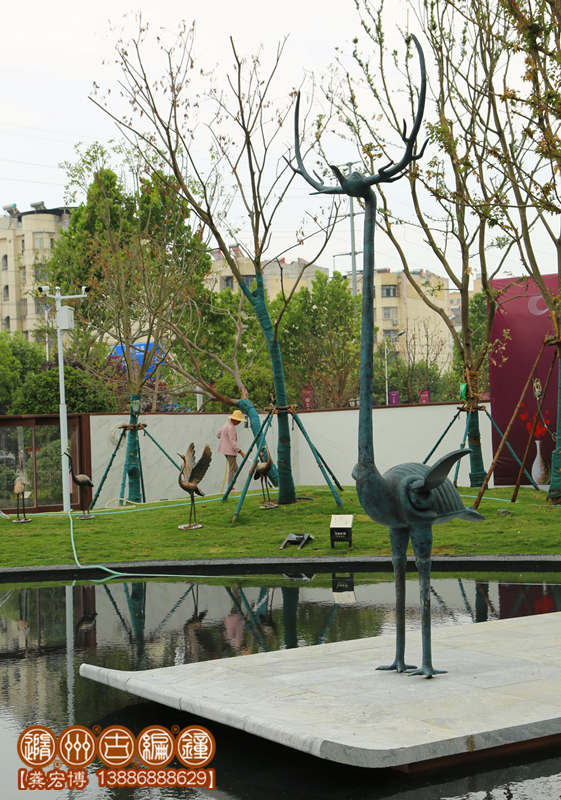 青銅古鎮(zhèn)文化雕塑——鹿鶴,高度4米,銅鑄造工藝制作。